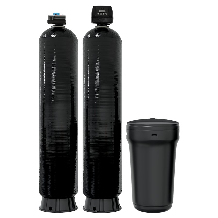 В состав системы входят два фильтра, оснащённые общим блоком управления, и бак для приготовления солевого раствора.
