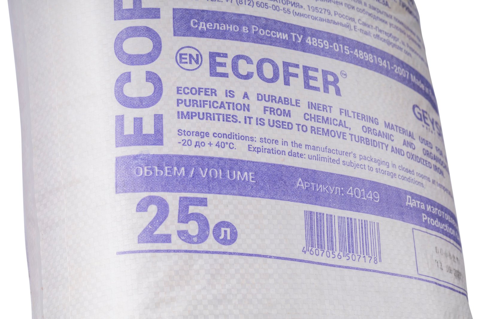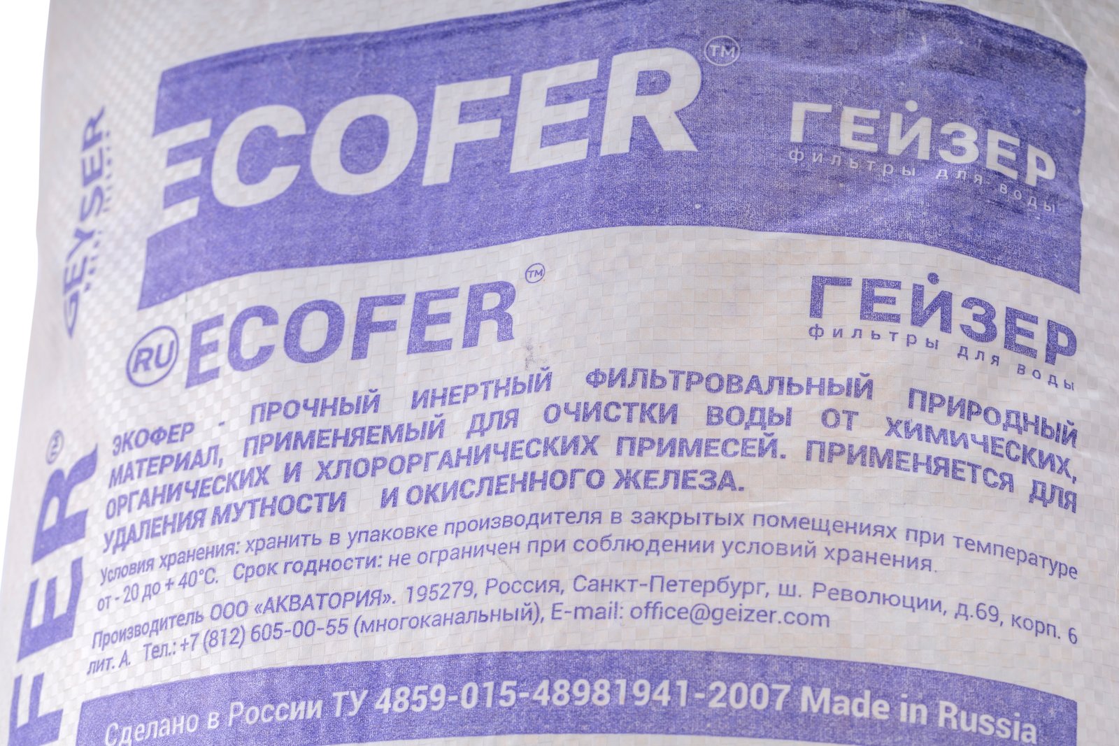 Ecofer – искусственный гранулированный каталитический алюмосиликатный фильтрующий материал, изготовленный из природного сырья. Для восстановления его фильтрующей способности (регенерации) не требуются химические реагенты: достаточно обратной промывки. Каталитически активные компоненты входят в структуру гранулы загрузки, что обеспечивает эффективную работу даже при ее разрушении.
