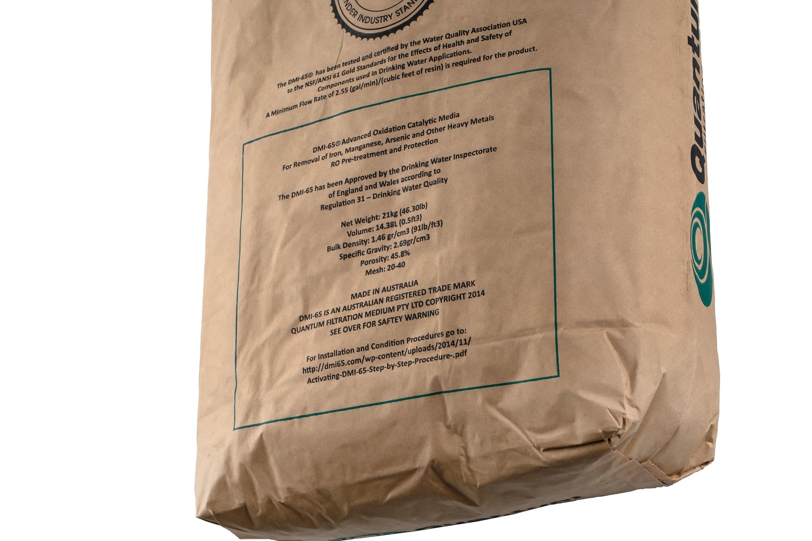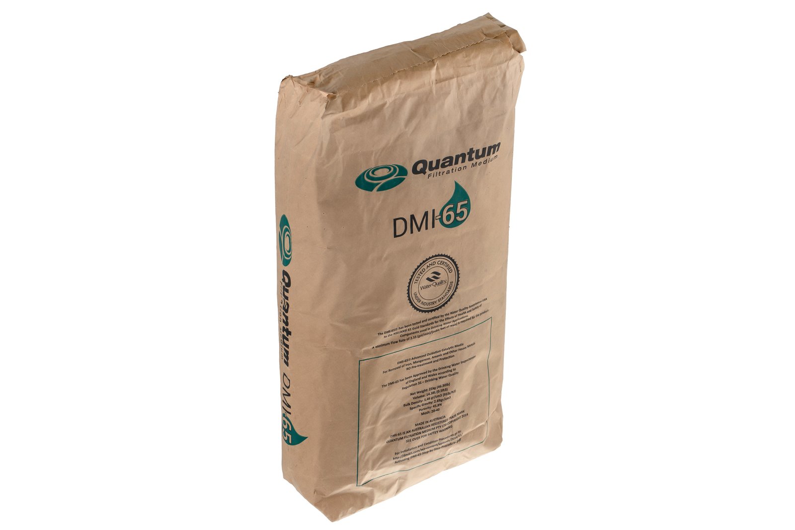 Quantum DMI–65 — каталитический фильтрующий материал, предназначенный для удаления из воды железа и марганца. Основное преимущество этой загрузки заключается в том, что она не нуждается в регенерации раствором перманганата калия. Кроме того, с помощью данного материала можно снизить содержание железа при его начальной концентрации порядка 30–35 мг/л до величины 0,005 мг/л, а марганца — с 3 мг/л до 0,001 мг/л.