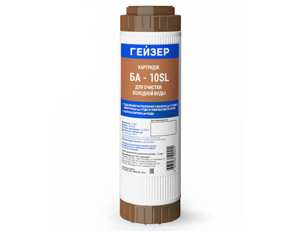 Картридж БА - 10SL применяется в бытовых фильтрах Гейзер 3 К Люкс, Гейзер БИО 341 и Гейзер Ультра БИО 441 для очистки воды от растворенного железа.