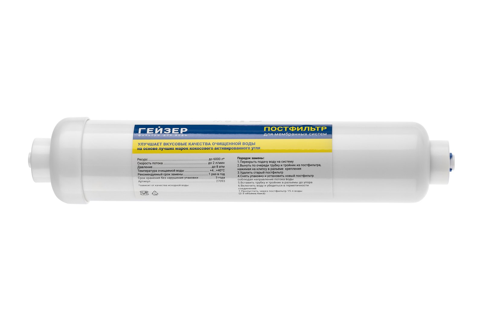 Угольный постфильтр используется для доочистки и кондиционирования воды, очищенной системой обратного осмоса. Удаляет посторонние привкусы и запахи, которые могут появиться при длительном хранении воды в накопительном баке. Для моделей Гейзер Престиж с датой производства до января 2014 года рекомендуется приобретение угольного постфильтра с фитингами для подключения.