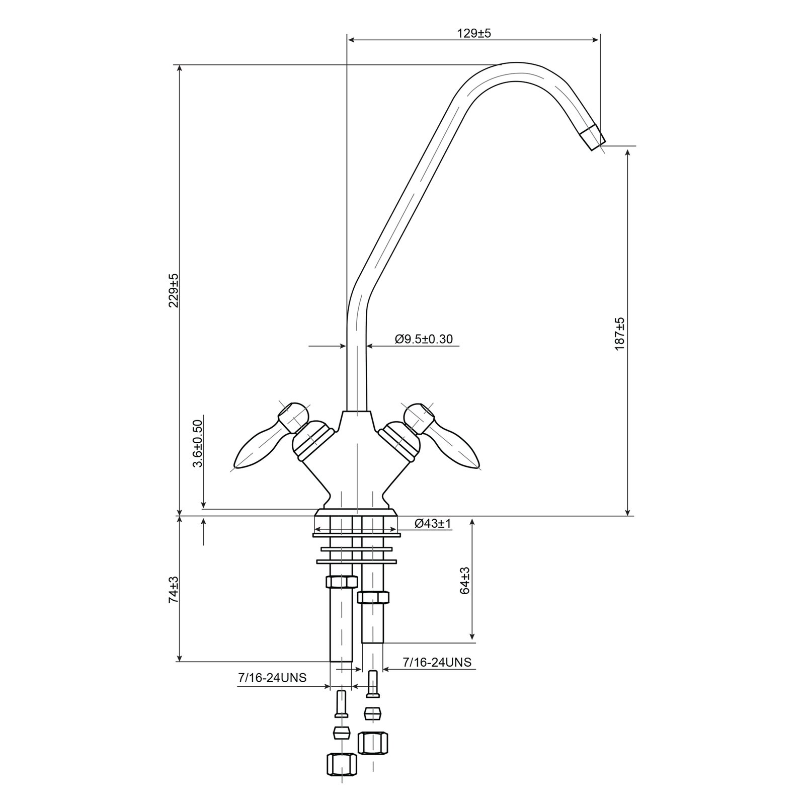 Кран с двумя вентилями обеспечивает подачу воды с минералами или без них. Кран изготовлен из современных экологически безопасных материалов с нанесением особо прочного хромированного покрытия и рассчитан на работу с холодной водой. Кран устанавливается на мойку или столешницу в любом удобном для эксплуатации месте.