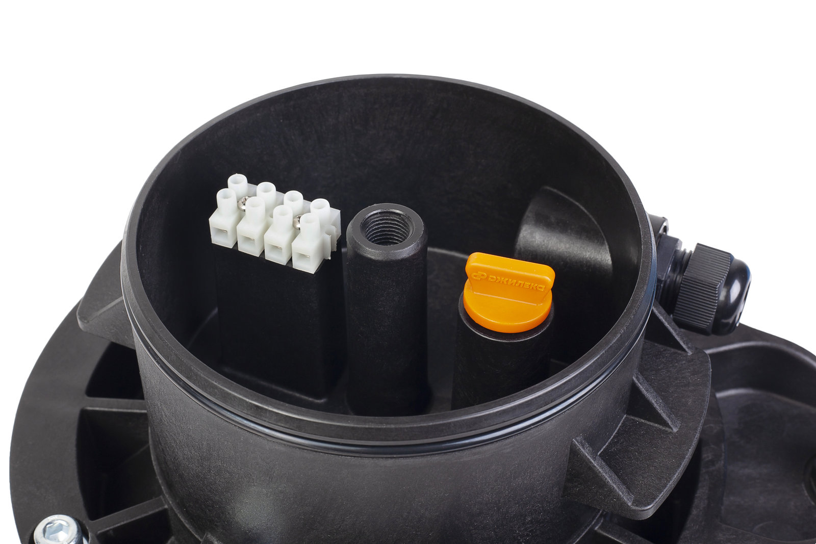 Предназначена для обустройства скважин в тех случаях, когда напорная труба от насоса выведена радиально ниже уровня среза обсадной трубы не менее чем на 200 мм (например, через скважинный адаптер).Крышка скважины применяется для того, чтобы герметизировать срез обсадной трубы скважины, обеспечить герметичный ввод и соединение электрокабеля насоса круглого сечения с наружным диаметром оболочки от 7 мм до 11 мм, с количеством проводников до 4-х, с сечением проводников до 2,5 мм?, содержит проушину для подвеса насоса и дополнительную съемную заглушку для крепления шнура сливного клапана.