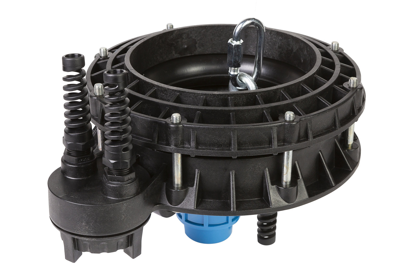 Предназначен для герметизации устья скважины с наружным диаметром обсадной трубы от 140 до 160 мм. Предохранит скважину от попадания в неё поверхностных, грунтовых вод и посторонних предметов. Позволяет увеличить дебит неглубоких скважин за счет образующегося разрежения между оголовком и понижающимся в процессе работы насоса уровнем воды. Изготовлен из высокопрочного пластика. Повышает надежность подвешивания насоса. Упрощает эксплуатацию технического колодца. Оголовок, с базовой (стационарной) частью крепится на обсадной трубе один раз за весь период эксплуатации оголовка. На базовую часть, в свою очередь, устанавливается съемная крышка, через которую проходят электрокабель и напорная труба. Такие оголовки позволяют производить простое, многократное соединение/разъединение электрокабеля в клеммной коробке при извлечении насоса из скважины. Рассчитан на подвешивание груза до 200 кг.